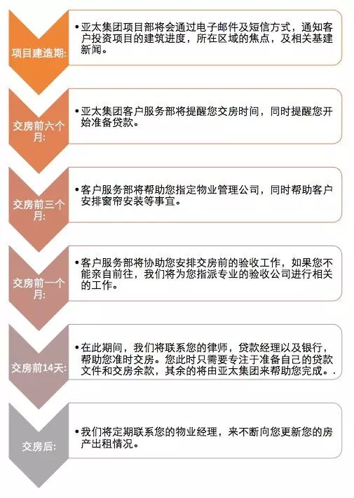 除了申请贷款,在交房前,我们协助客户做的另一件事就是指定物业管理公司。由于我们的大部分客户都是投资者,因此找到一家专业的物业管理公司,将会给房产的出租事宜带来极大的便利。亚太集团在各大首府城市也都成立了自己的物业管理团队,越来越多的客户将他们的房产交给我们管理,最大程度减少了投资者对于交房过程的担忧。