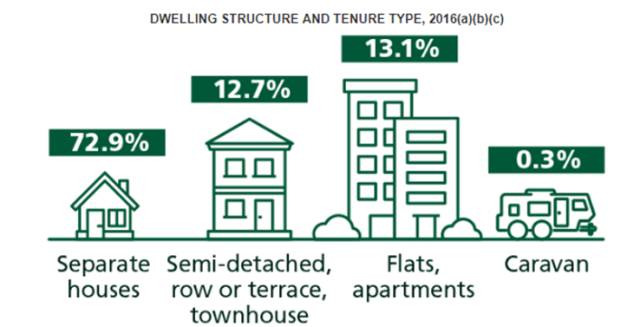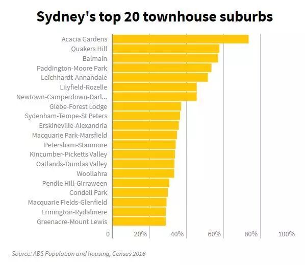 以悉尼为例,在2016年的人口普查当天,悉尼的联排别墅占整个城市的房产数量的大约14%,而五年前的这一数据为12.8%。在悉尼,有五个区超过50%的人口居住在联排别墅中,它们遍布在从距离市中心几十公里的远郊区到距离市中心近在咫尺的成熟区。