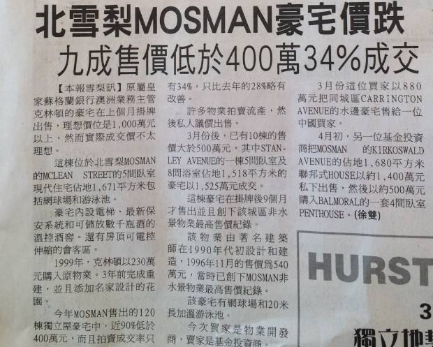 (2011年的澳洲报纸,当时的悉尼房市依然处于低谷中,Mosman豪宅跌幅明显,清拍率仅34%)