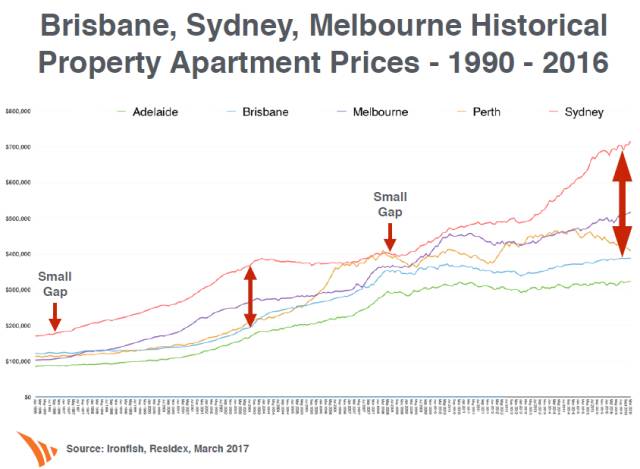 (澳洲五大首府城市过去26年的公寓房价走势图,首府城市间的房价差距由小变大,由大缩小,周而复始)