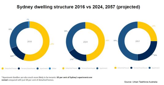 过去25年,由于人口的快速增长,悉尼的独立屋比例已经由90年代的68%下降到如今的55%左右。人们普遍预计,到2024年左右,悉尼居住在独立屋内的人口比例,将下降到50%以下。