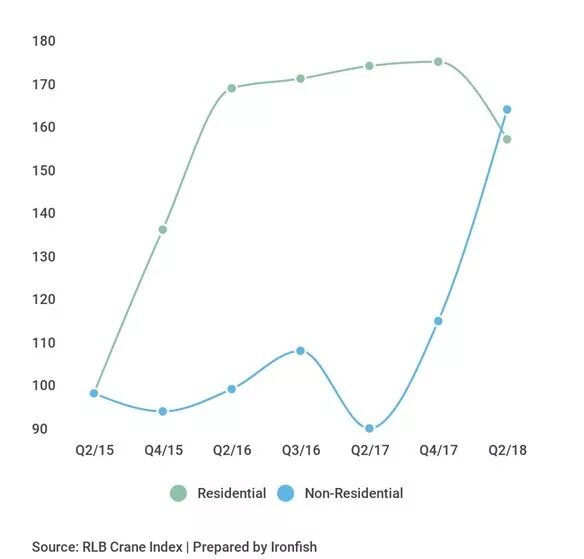 其中,有一个非常有意思的数据,叫做“吊车指数”(Crane Index),被用来描述澳洲的工程建设数量和趋势。而根据澳洲金融评论的报道,2018年第三季度,澳大利亚全国的工程吊车数量达到了惊人的735个,仅悉尼一个城市的吊车数量就超过了美国全国!